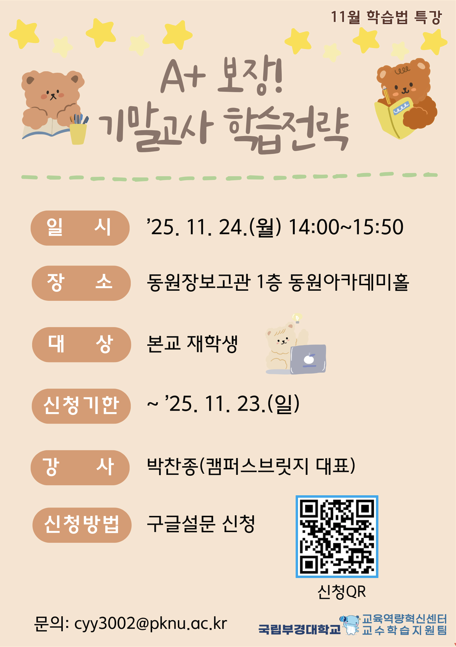 2025학년도 11월 학습법 특강을 아래와 같이 실시하오니, 많은 학부 재학생들의 참여 바랍니다. 가. 일 시: ’25. 11. 24.(월) 14:00 ~ 15:50 나. 장 소: 대연캠퍼스 동원장보고관 1층 동원아카데미홀 다. 참여대상: 본교 학부 재학생 라. 신청방법: 구글 설문 신청(https://forms.gle/iyJ24uzjpZGJJKXe9) 마. 신청기한: ~ ’25. 11. 23.(일) 바. 특강주제: A+보장! 기말고사 학습전략 사. 강 사: 박찬종(캠퍼스브릿지 대표)