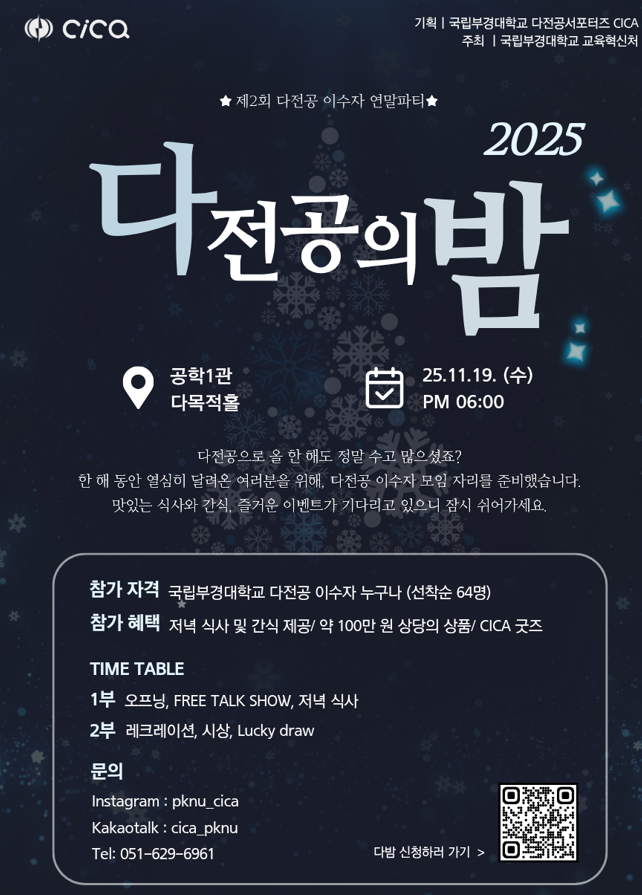 다전공 이수 활성화와 다전공자 전용 커뮤니티 형성을 위한 「제2회 다전공의 밤」행사를 개최하오니 관심있는 학생들의 많은 참여 바랍니다. 가. 운영일시: 2025. 11. 19.(수) 18:00 ~ 21:00 나. 운영장소: 공학1관 3층 다목적홀 다. 참여대상: 다전공(일반 부·복수전공, 융합전공, 학생설계전공, 마이크로전공)을 이수 중인 학생 64명 라. 신청방법: 네이버폼 신청(https://form.naver.com/response/nT7ZMXHG76BjAe5yzkDnNQ) ※ 선착순 마. 주요내용 - 1부: 오프닝, 프리토크쇼, 저녁식사 - 2부: 레크레이션, 시상식 등