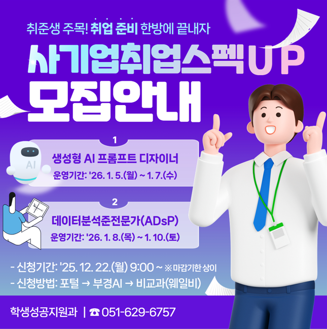 | 이전 | [부산공유대학] AI혁신전공 2026학년도 1학기 참여 희망 학생 수요조사 |