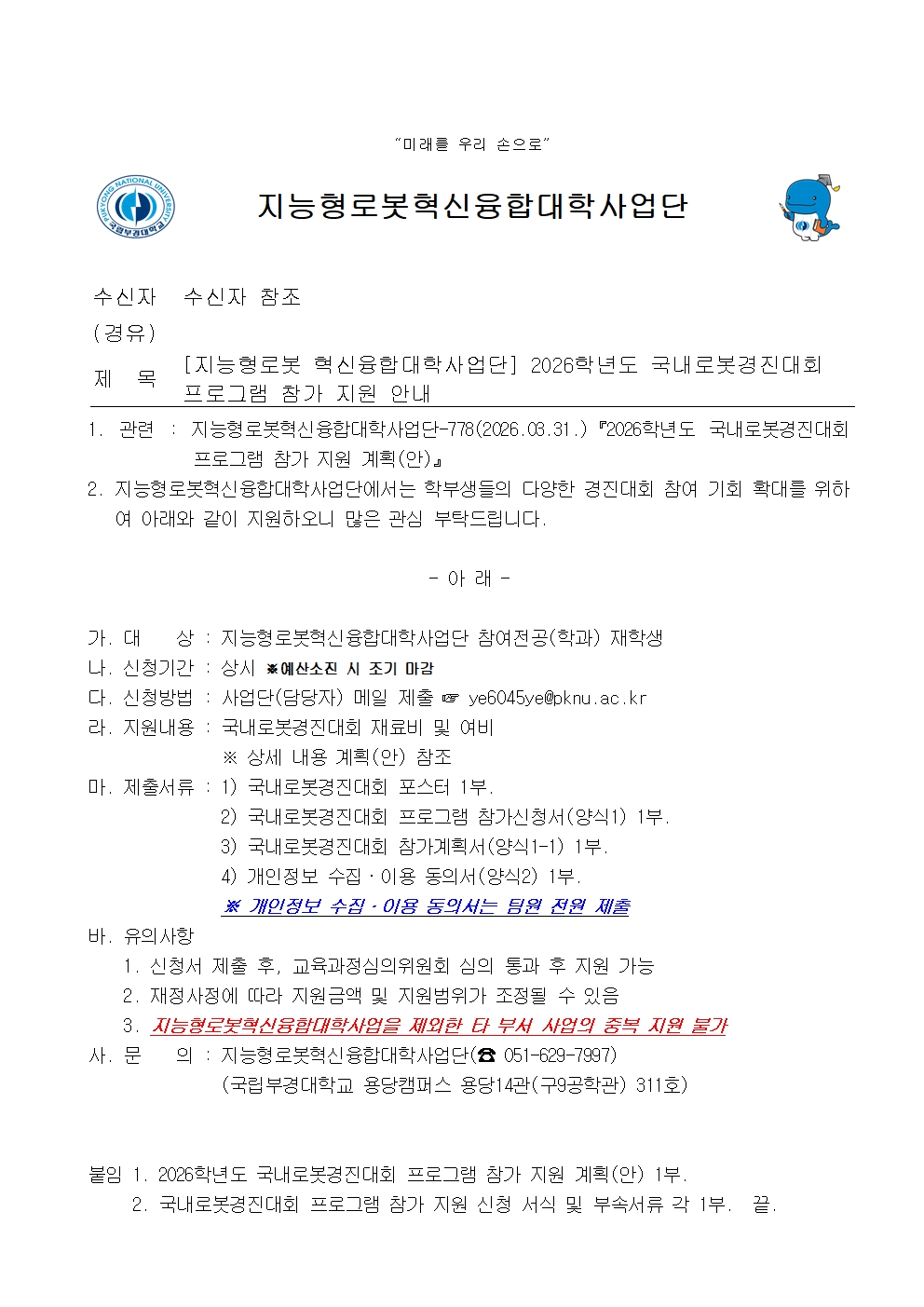 | [지능형로봇 혁신융합대학사업단] 2026학년도 국내로봇경진대회 프로그램 참가 지원 안내 | |||