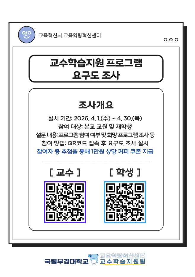 가. 실시기간: 2026. 4. 1.(수) ~ 4. 30.(목), 4주간 나. 참여대상: 재학생 다. 설문내용: 소속, 교수?학습지원 프로그램 참여 여부, 희망 프로그램 조사 등 라. 참여방법: 포스터 QR코드 접속 후 요구도 조사 실시 ※ 요구도 조사 참여자 중 250명을 추첨하여 1만원 상당 기프티콘 증정